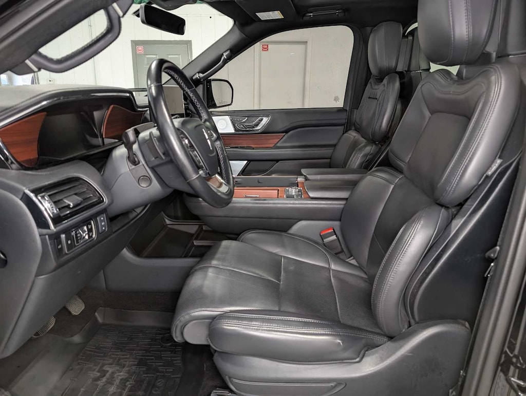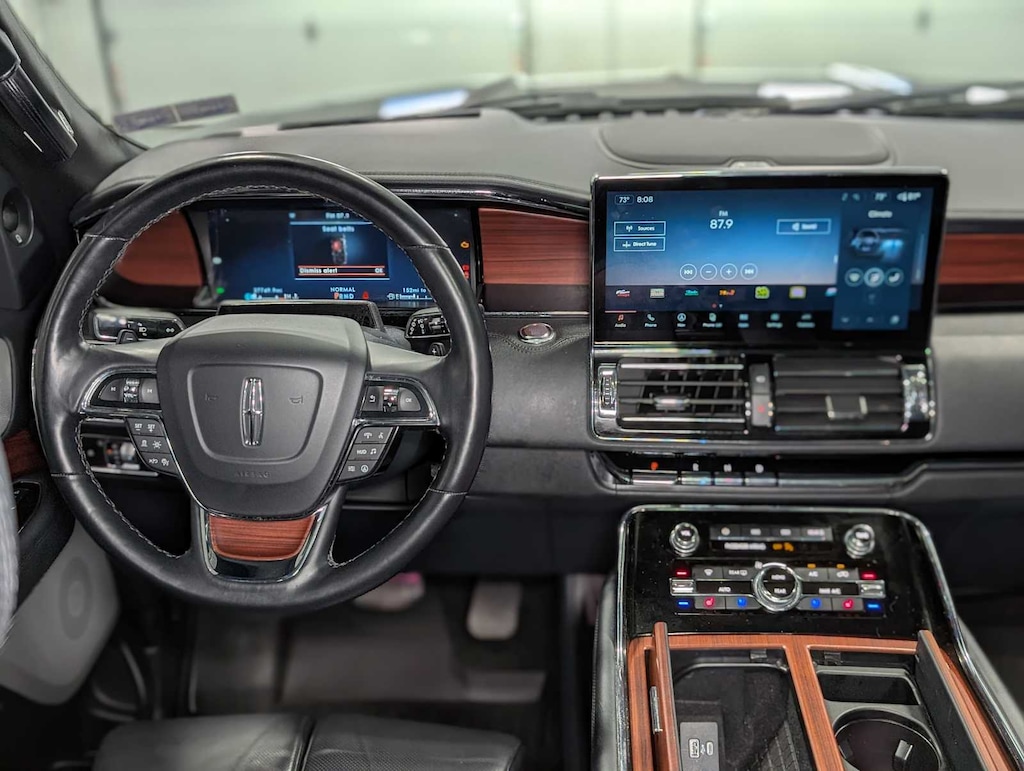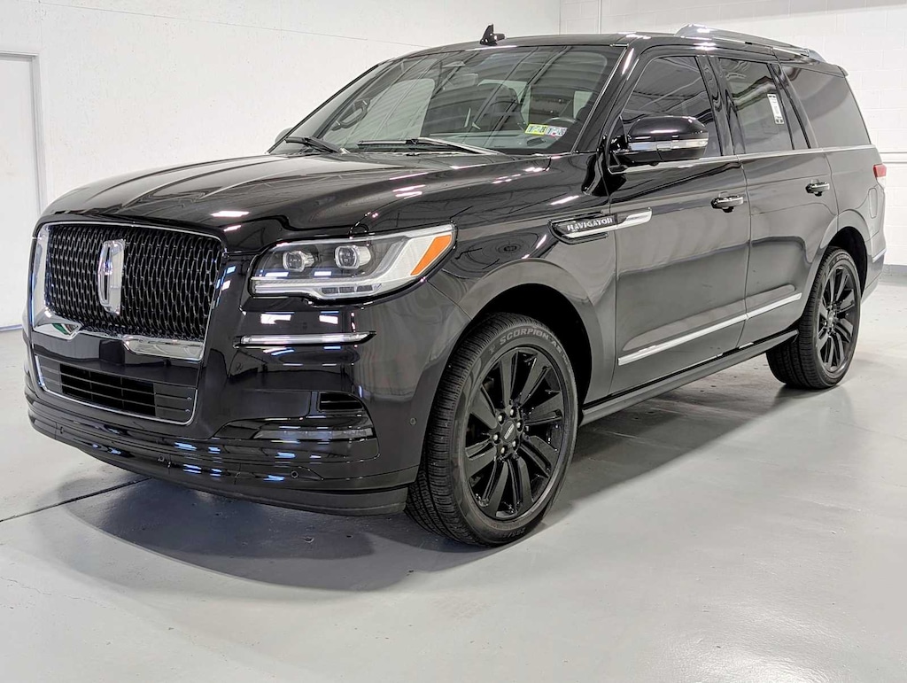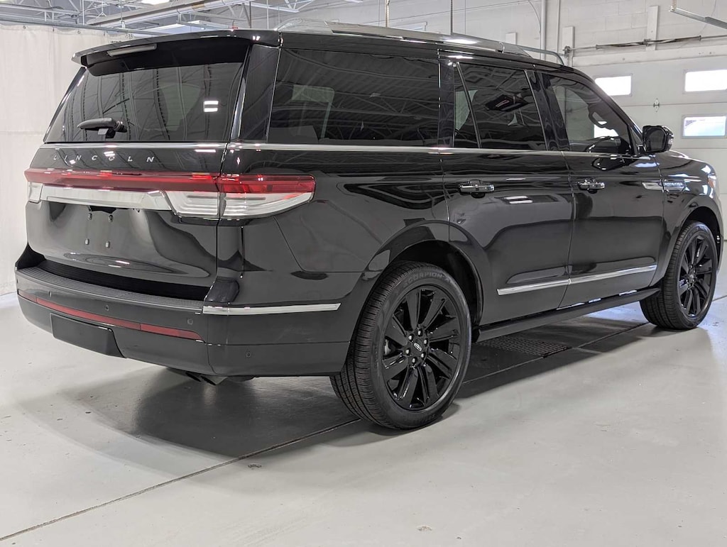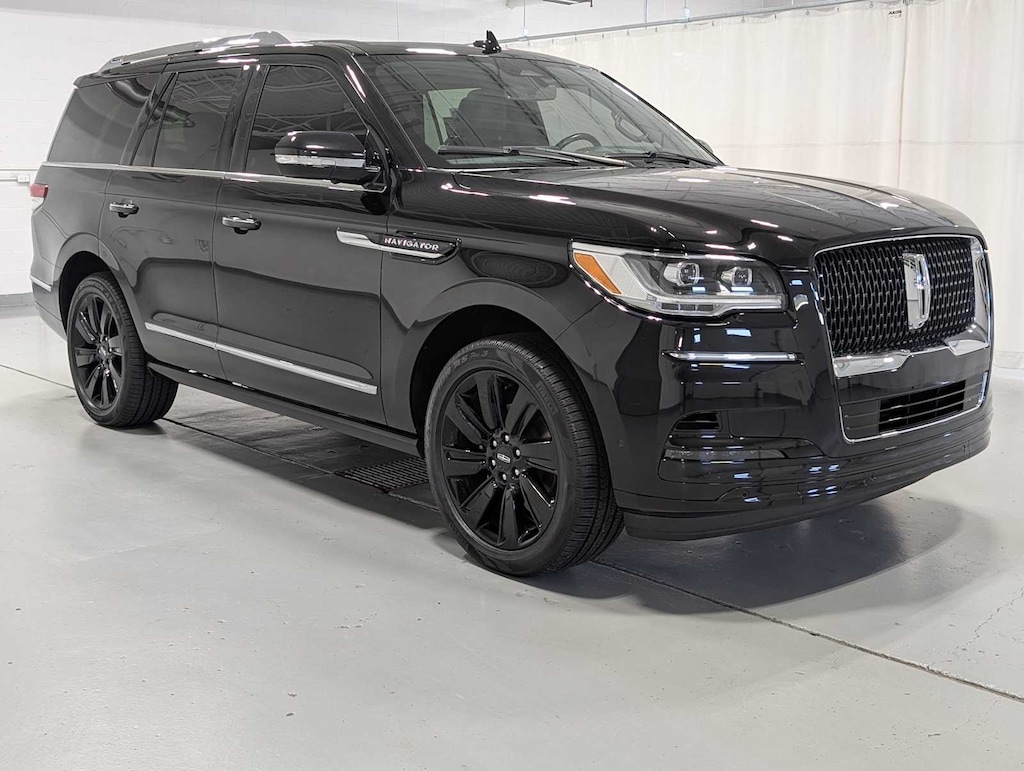 EQUIPMENT GROUP 201A RESERVE I Luxury Package, Perfect Position Seats (30-Way) w/Active Motion, power thigh extender, head restraints and auto heated/ventilated w/memory, Illuminated 1st & 2nd Row Seat Belts, ambient lighting w/LED, Lincoln Lit Star in Grille, Radio: Revel Ultima 3D Audio System w/28 Speakers, subwoofer (featuring QuantumLogic 3D Surround technology), MONOCHROMATIC PACKAGE Wheels: 22 Black Aluminum, Body-Color Exterior Mirror Finish, Monochromatic Lincoln Grille, lower body-color bumper accent, Monochromatic Lincoln Badge, ALL-WEATHER FLOOR LINERS W/CARPET FLOOR MATS Front and rear, TRANSMISSION: 10-SPEED AUTOMATIC W/SELECTSHIFT paddle activation (STD). 2023 Lincoln Navigator with Infinite Black Metallic Clearcoat exterior and Black Onyx interior features a V6 Cylinder Engine with 440 HP at 5500 RPM*.