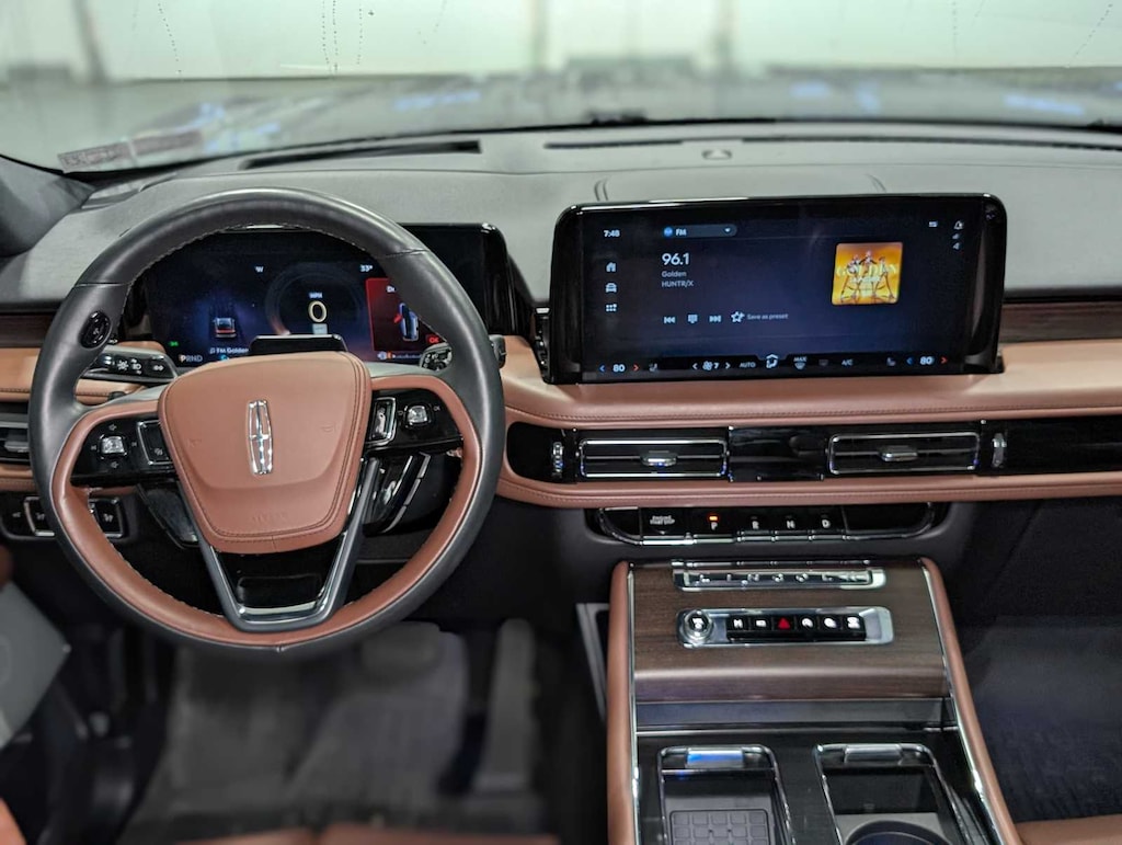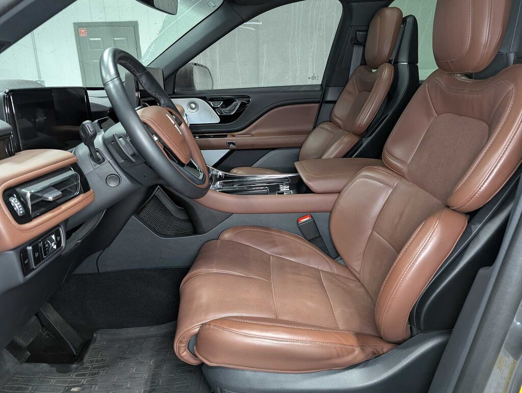 EQUIPMENT GROUP 201A Wheels: 22 Bright-Machined Aluminum, magnetic-painted pockets and adaptive suspension, Note: Adaptive suspension includes noise reduction module and sound insulation pack, Tires: 275/40R22 107 W-Rated, Illumination Package, Lincoln Dynamic Signature Lighting, LED daytime running lamps (sequential fade on/off), Illuminated Lincoln Star in Grille, Speed Dependent Lighting, Adaptive Pixel LED Headlamps, Adaptive Dynamic Bending Lighting, Advanced Heads-Up Display, Auto Air Refresh, Wireless Charging Pad, Luxury Package, Heated & Ventilated Rear Seats, 30-Way Perfect Position Seats w/Active Motion, massage, Radio: Revel Ultima 3D Audio System w/28 Speakers, subwoofer and QuantumLogic 3D Surround technology, TRANSMISSION: 10-SPEED AUTOMATIC W/SELECTSHIFT (STD). 2025 Lincoln Aviator with Asher Gray Metallic Clearcoat exterior and Hot Chocolate interior features a V6 Cylinder Engine with 400 HP at 5500 RPM*. Originally bought here