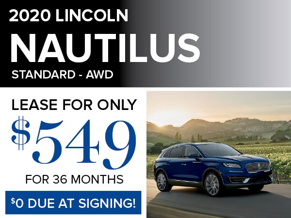 2020 LINCOLN NAUTILUS STANDARD AWD VIN: 2LMPJ8J93LBL07592. STOCK #F82769. 36 month lease based on 7,500 miles per year with $0 total due at signing. Includes $0 sec. dep., Must have owner loyalty. With approved credit. Tax, title and license extra. Offer expires 3-31-21.