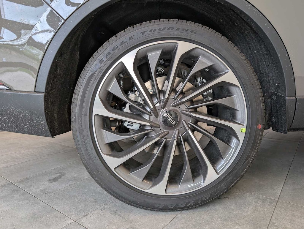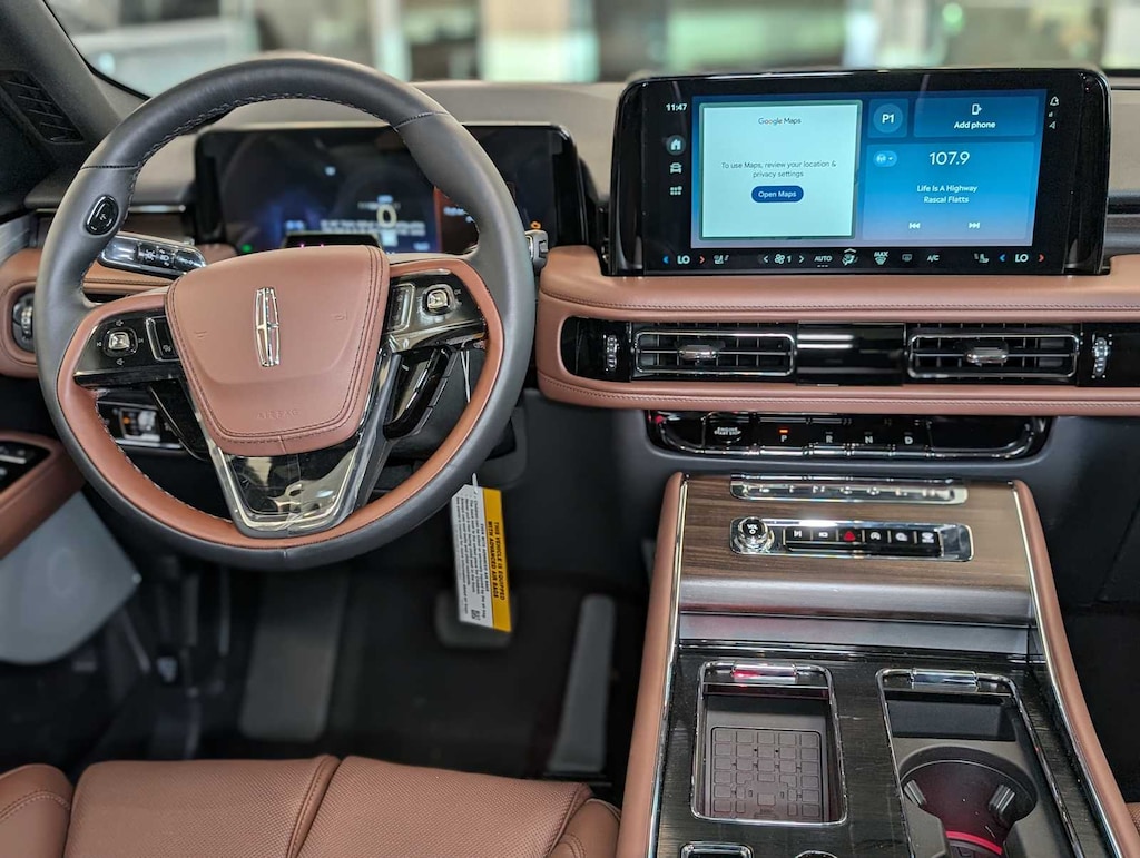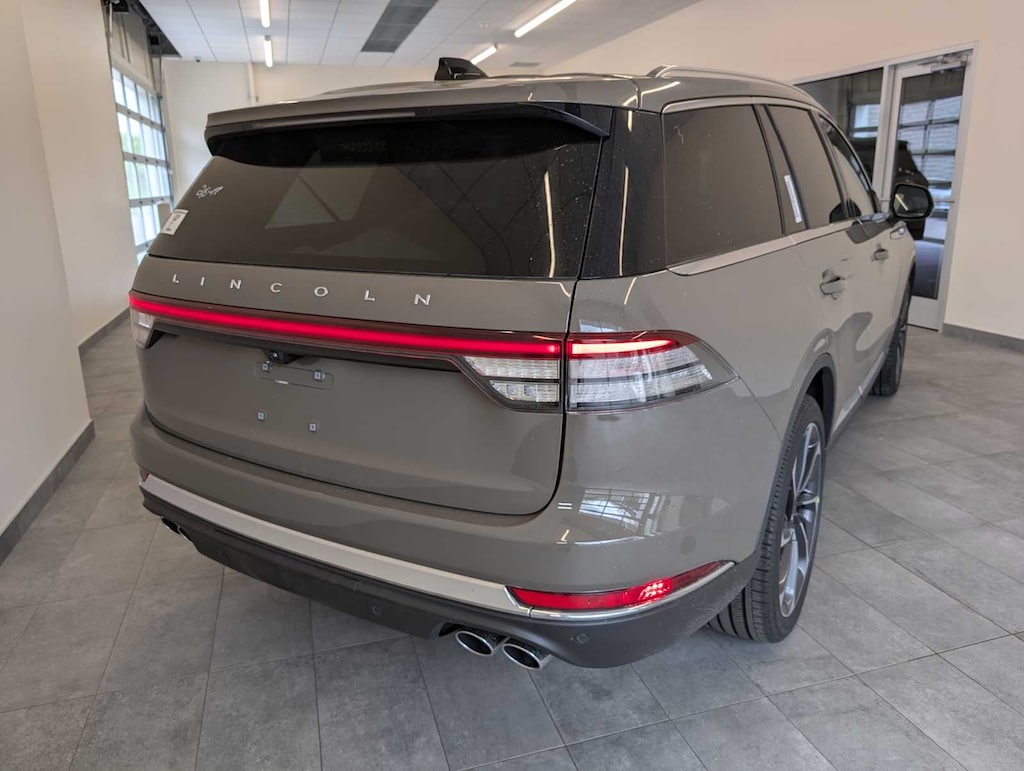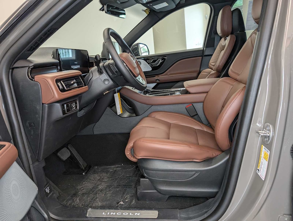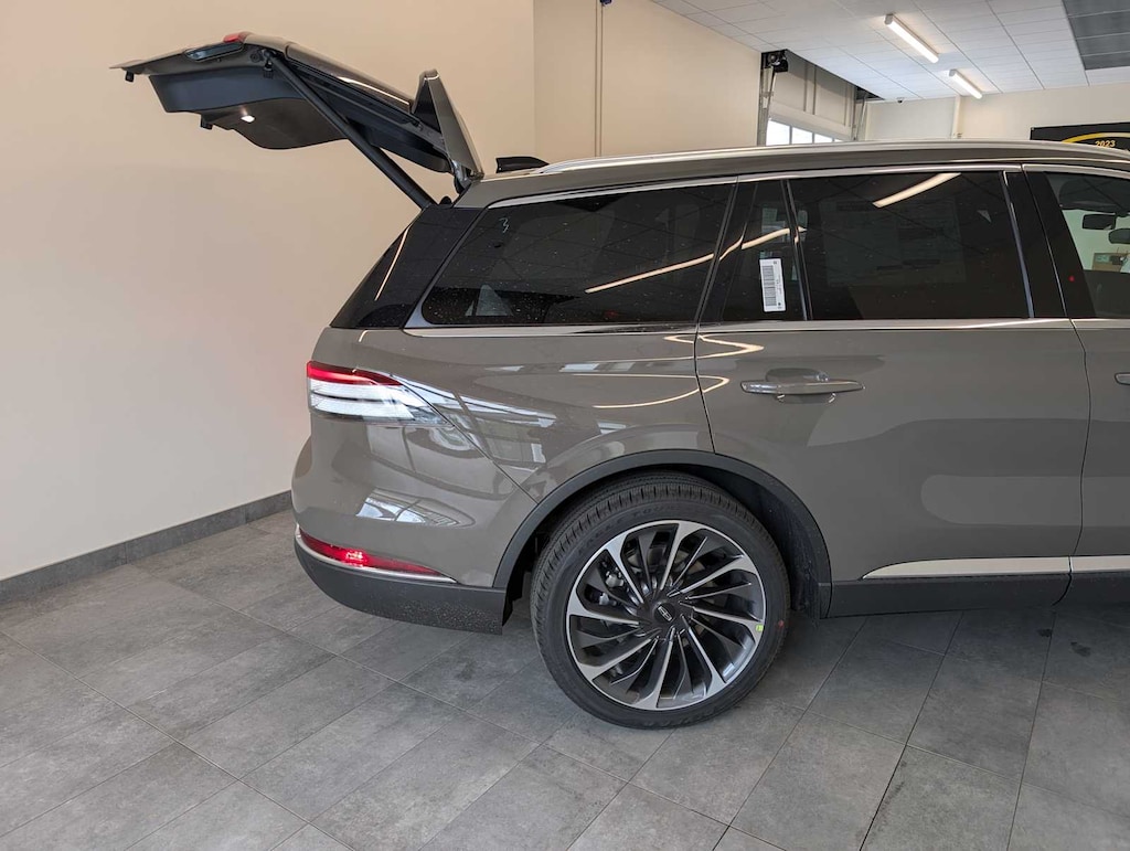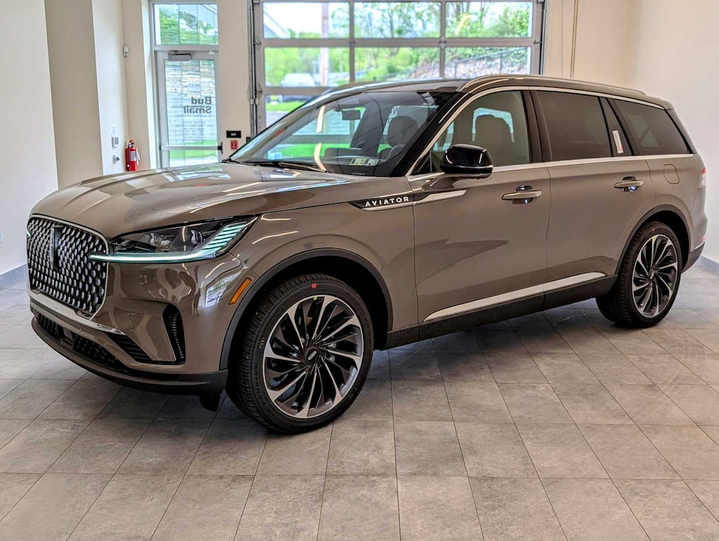EQUIPMENT GROUP 201A Wheels: 22 Bright-Machined Aluminum, magnetic-painted pockets and adaptive suspension, Note: Adaptive suspension includes noise reduction module and sound insulation pack, Tires: 275/40R22 107 W-Rated, Illumination Package, Lincoln Dynamic Signature Lighting, LED daytime running lamps (sequential fade on/off), Illuminated Lincoln Star in Grille, Speed Dependent Lighting, Adaptive Pixel LED Headlamps, Adaptive Dynamic Bending Lighting, Heated/Ventilated Cooled Driver & Passenger Seats, Advanced Heads-Up Display, Auto Air Refresh, Wireless Charging Pad, Luxury Package, Heated & Ventilated Cooled Rear Seats, 30-Way Perfect Position Seats w/Active Motion, massage, Radio: Revel Ultima 3D Audio System w/28 Speakers, subwoofer and QuantumLogic 3D Surround technology, TRANSMISSION: 10-SPEED AUTOMATIC W/SELECTSHIFT (STD). 2025 Lincoln Aviator with Harbor Gray Metallic Clearcoat exterior and Hot Chocolate interior features a V6 Cylinder Engine with 400 HP at 5500 RPM*.
