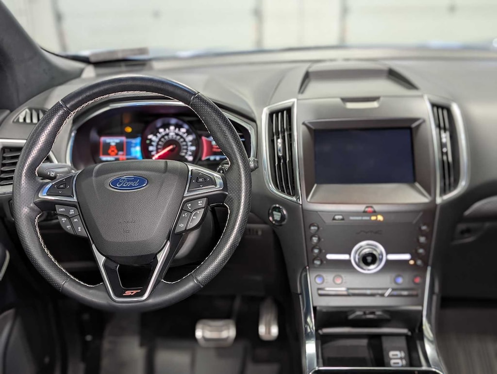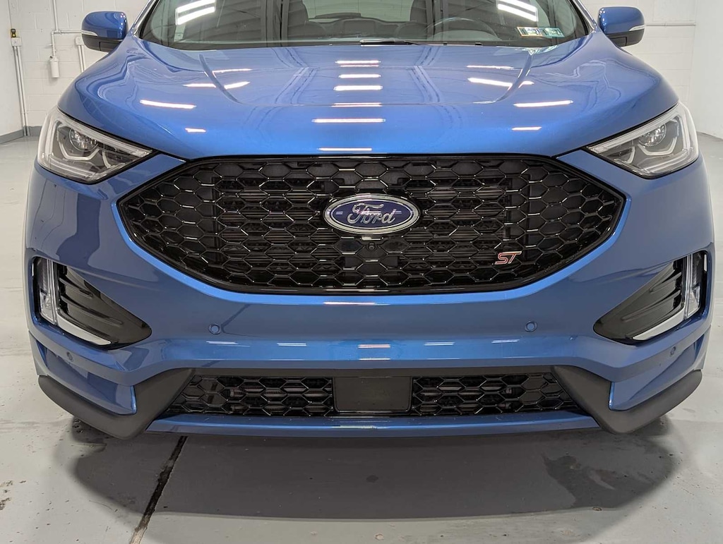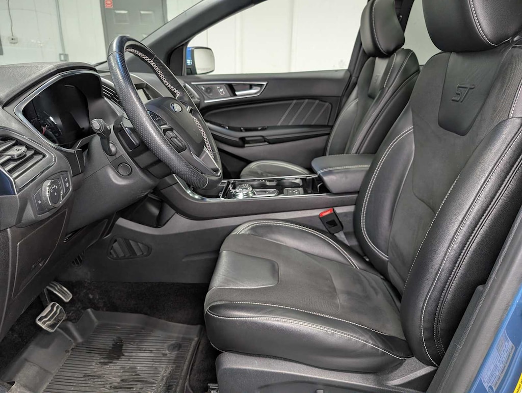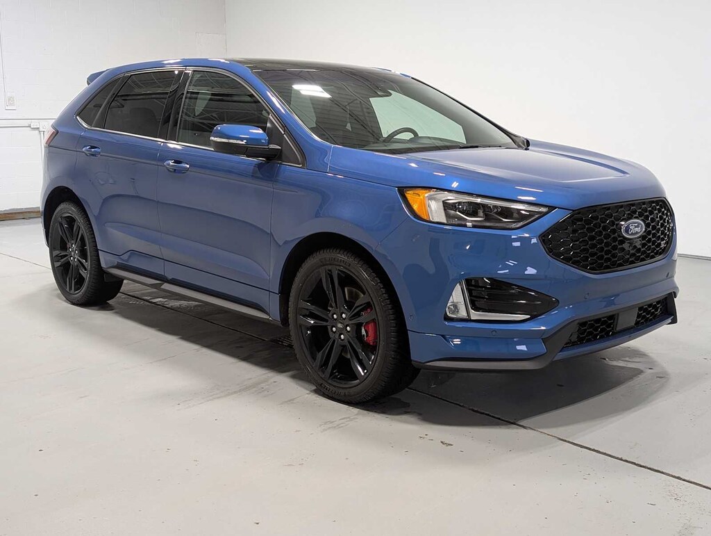 EQUIPMENT GROUP 401A Active Transmission Warm-Up, Evasive Steering Assist, Heated Rear Seats, Lane Centering, Enhanced Active Park Assist, parallel park, park out assist, reverse perpendicular parking, forward and reverse and side sensing systems, Adaptive Cruise Control w/Stop & Go, Adaptive LED Headlamps, LED amber light blade turn signals, Front 180-Degree Camera w/Split View & Washer, Auto-Dimming Drivers Sideview Mirror, Panoramic Vista Roof, power open/close w/power shade, Standard 2nd row LED dome light is replaced w/2 single lights, Switch located in each grab handle pocket, Voice-Activated Touchscreen Navigation System, pinch-to-zoom capability, SiriusXM Traffic & Travel Link, a, Services are not available in Alaska and Hawaii, SiriusXM audio and data, ST PERFORMANCE BRAKE PACKAGE vented brake shields, Brushless Radiator Cooling Fan, Performance Brake Pads, Wheels: 21 Premium Gloss Black-Painted Alum w/66P, Painted aluminum, Front & Rear Vented Disc Brakes, unique front rotors (13.6), Painted Colorado Red Brake Calipers, Tires: 21 Summer Only, tire inflator and sealant kit, COLD WEATHER PACKAGE Front & Rear Floor Liners, Custom accessory, pre-installed, Windshield Wiper De-Icer, Heated Steering Wheel, WHEEL-LOCKING LUG NUTS (DEALER INSTALLED). 2020 Ford Edge with Ford Performance Blue exterior and Ebony interior features a V6 Cylinder Engine with 335 HP at 5500 RPM*. Locally Owned and Traded