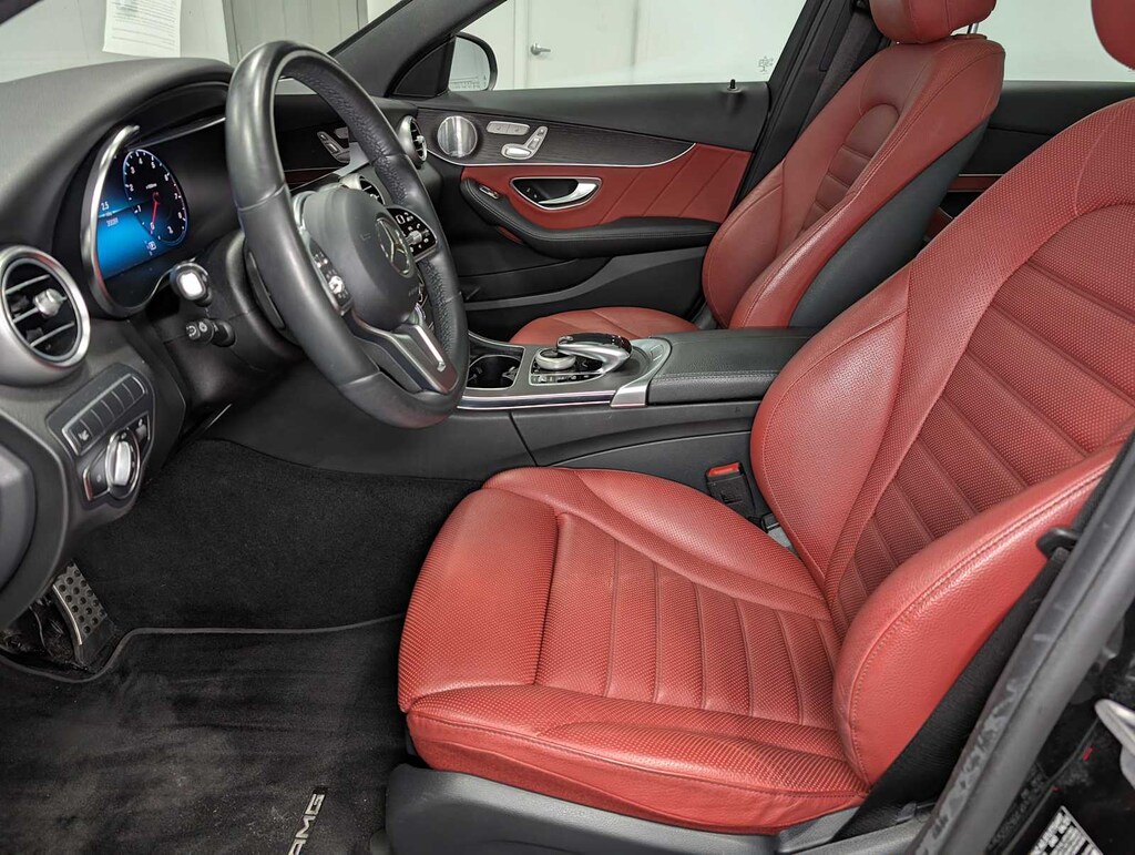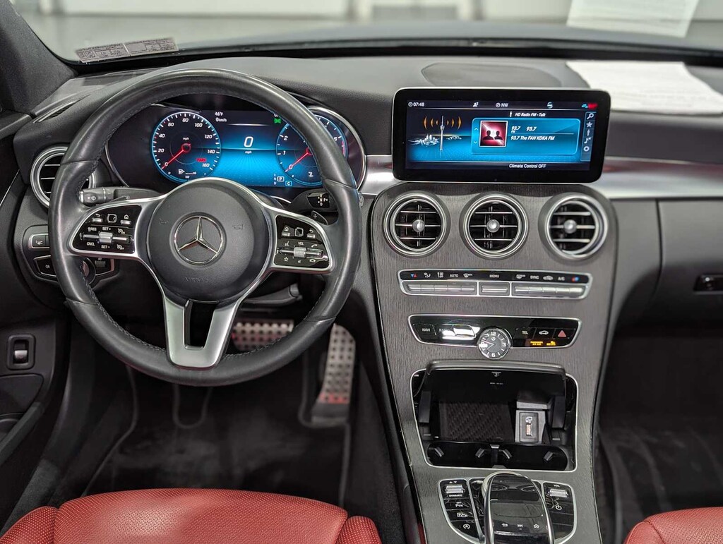 AMG® LINE: AMG® Body Styling, Sport Suspension w/Sport Steering System, Diamond Grille, AMG® Line Interior, AMG® Floor Mats, Brushed Aluminum Sport Pedals w/Rubber Studs, Flat-Bottom Sport Steering Wheel, Black Fabric Headliner, AMG® Line Exterior, AMG® CRANBERRY RED, LEATHER UPHOLSTERY, PREMIUM PACKAGE SiriusXM Satellite Radio, 6-month all-access plan trial, 64-Color Ambient Lighting, Illuminated Door Sills, Burmester® Surround Sound System, MULTIMEDIA PACKAGE Touchpad, COMAND® Navigation w/Voice Control, Live Traffic, Navigation Map Updates Included for 3 Years, PARKING ASSISTANCE PACKAGE Rear Cross Traffic Alert, PARKTRONIC w/Active Parking Assist, Parking Damage Detection, Surround View System, HEAD-UP DISPLAY, PANORAMA SUNROOF, VENTILATED FRONT SEATS, NIGHT PACKAGE: high-gloss black front splitter, grille trim, rear diffuser, side mirrors, window trim and side skirts, BODY COLOR REAR SPOILER, HEATED STEERING WHEEL Heating for Multifunction Steering Wheel. 2021 Mercedes-Benz C 300 with Black exterior and AMG® Cranberry Red interior features a 4 Cylinder Engine with 255 HP at 5800 RPM*. Locally Owned and Traded